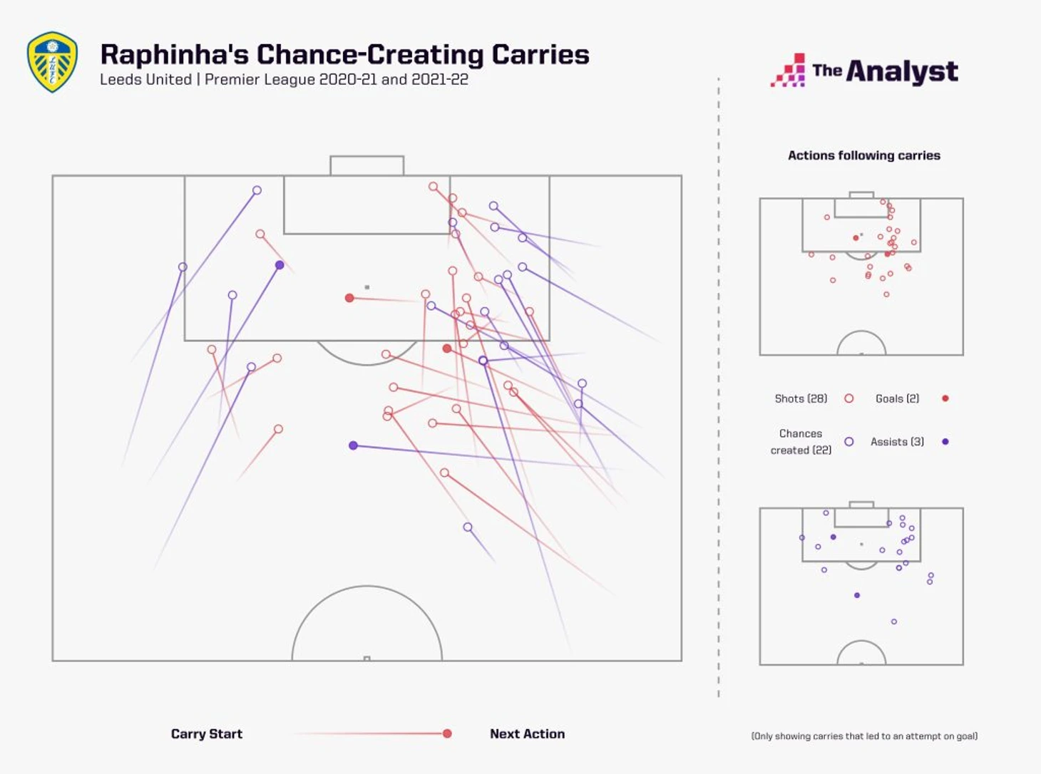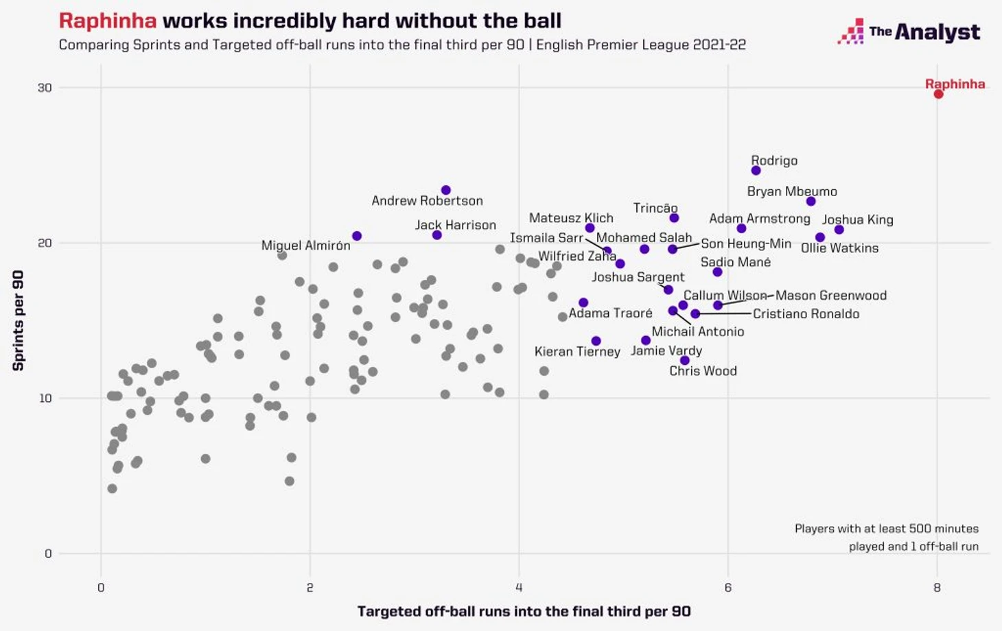 А Рафинья должен в отсутствие Неймара вместе с Вини играть все большую роль. Воспитанник «Аваи» продолжает прогресс даже в турбулентном в этом сезоне «Лидсе». Мы знаем о его созидательных способностях, но по работе без мяча в атаке он в Англии лучший с отрывом.