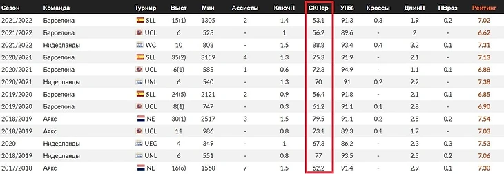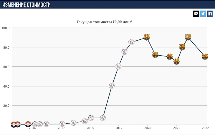 Также можно посмотреть на трансферную стоимость Де Йонга, из которой становится понятно, что своего пика он достиг в том самом сезоне в "Аяксе", а игра в "Барселоне" не так впечатляет.