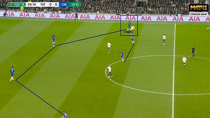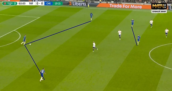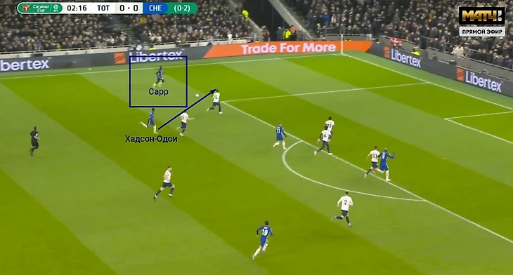 Так-то оно так, конечно. Схема периодически вырисовывалась в 4-2-2-2 с широкими позициями Маунта и Хадсона-Одои, но часто, особенно при розыгрыше, наблюдалась и картина, когда Рюдигер, Кристенсен и Аспи разыгрывали в тройке, а Сарр поднимался высоко на позицию левого латераля.