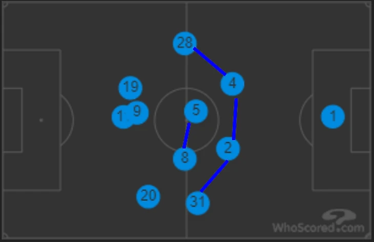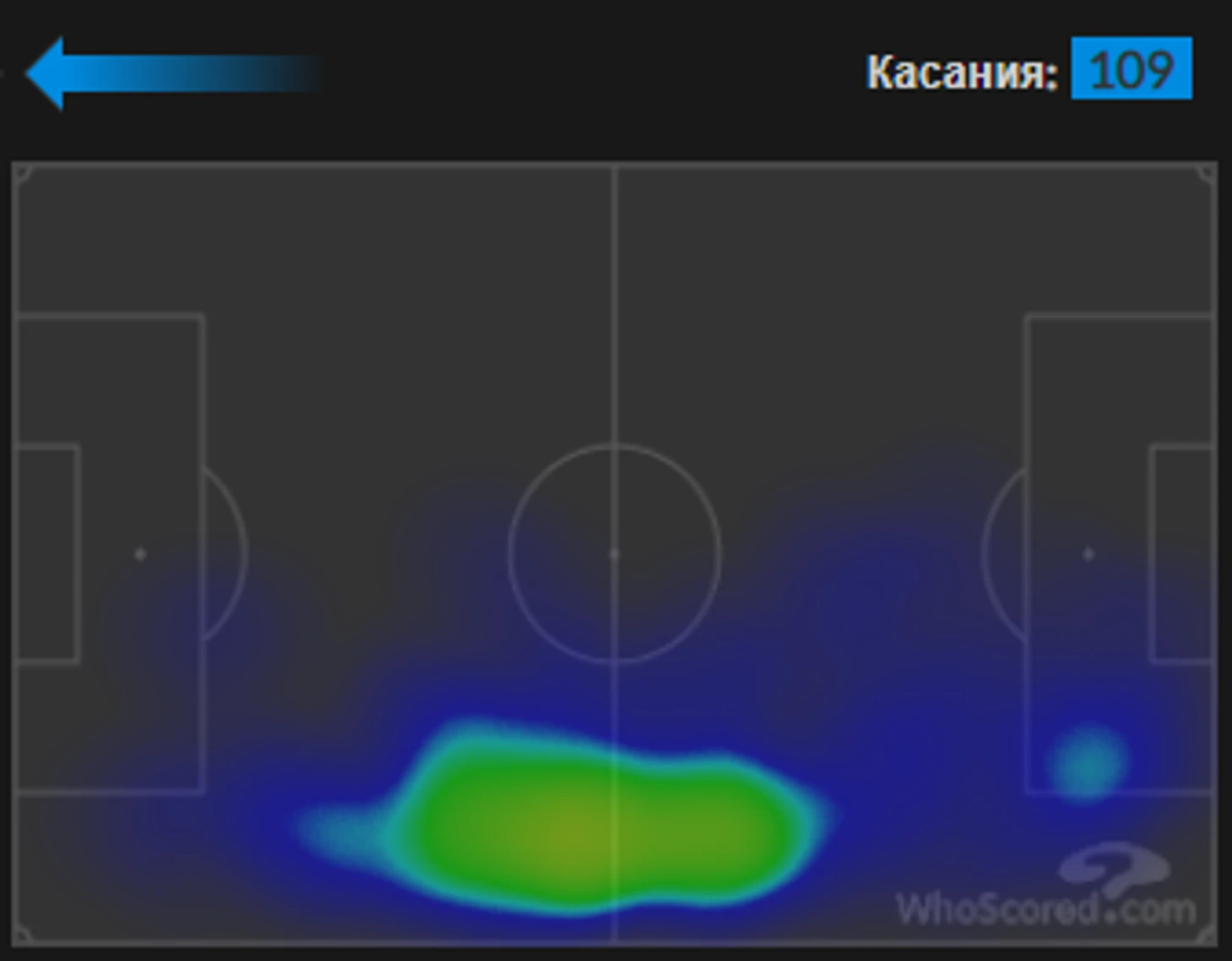 Так что это была гибридная схема 4-2-2-2 с переходом в 3-2-3-2, где одну ключевую роль сыграл именно Сарр , когда он становился латералем, а потом возвращался на позицию фулбэка. Это подтверждают нижеприведенные цифры.