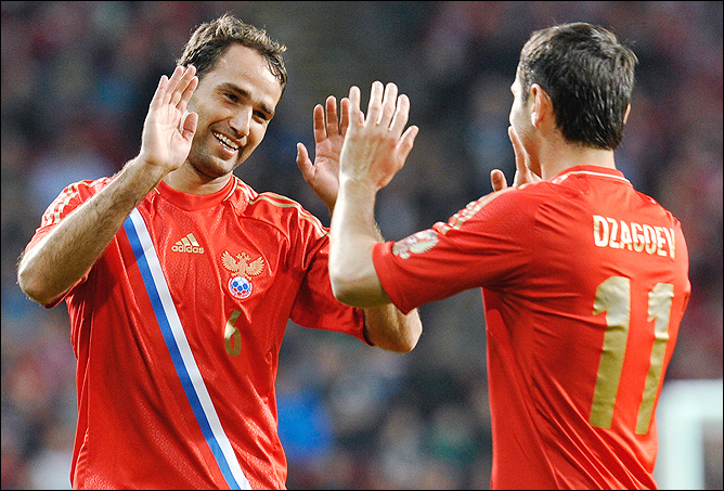 Российская сборная могла бы сейчас называться «сборной ЦСКА и "Зенита"». Санкт-Петербург в основном снабжает её нападающими и полузащитниками, а ЦСКА защитниками. Снабжают так хорошо, что в последнее время в составе оставалось только одно свободное место – для Юрия Жиркова из махачкалинского «Анжи». На матч с Данией выходил ещё голкипер Владимир Габулов (из «Анжи»), но лишь потому, что и Игорь Акинфеев из ЦСКА и Вячеслав Малафеев из «Зенита» были травмированы.