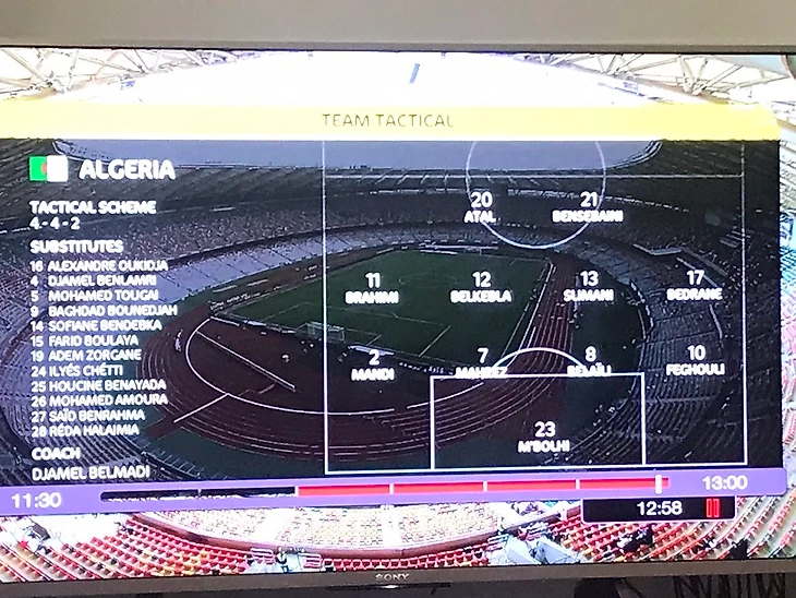 • У официального транслятора определенные проблемы со схемами. Например, вот так выглядела в первом туре схема сборной Алжира в трансляции. Вингеры Марез и Фегули – в защите, форвард Слимани – центральный полузащитник.