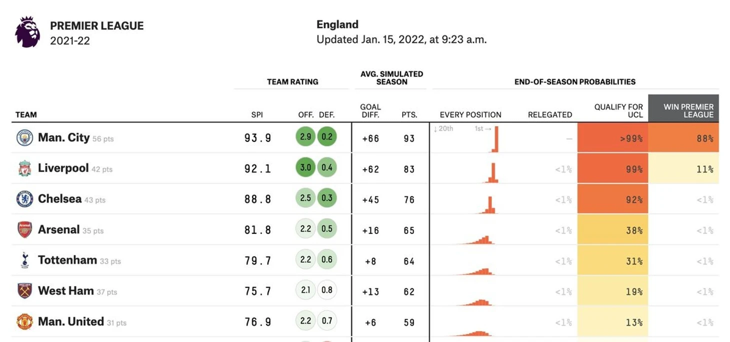 Сайт Five Thirty Eight, занимающийся спортивным прогнозированием – на основе 20 тысяч симуляций по методу Монте-Карло (получается очень точно, здесь подробнее о методике) – оценивает вероятность чемпионства «Манчестер Сити» в 88%. Шансы «Челси» на победу в АПЛ теперь меньше 1% – как и у 17 команд, кроме «Сити» и «Ливерпуля», которому пока еще дают 11% на борьбу.