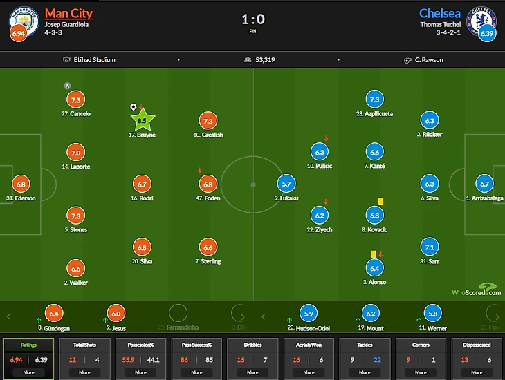 Несмотря на то, что Сити был заметно лучше и острее абсолютно во всех составляющих, очевидных моментов было не так и много, ведь оборона Челси трудилась, не покладая рук. Мне кажется, Гвардиола сознательно усложняет себе жизнь, не выпуская в старте Гюндогана. Родри очень здорово и надёжно действует в опорке, но Силва и Де Брейне всё-таки чистые креативщики. Отсутствие Илкая создаёт ощутимый дисбаланс, поскольку он - мастер игры между линиями, который творит и разрушает практически в одинаковом соотношении. Самое интересное, что это не первый матч, в котором Горожане испытывают проблемы при взломе обороны без Гюндогана, но Пеп принципиально продолжает гнуть свою линию.