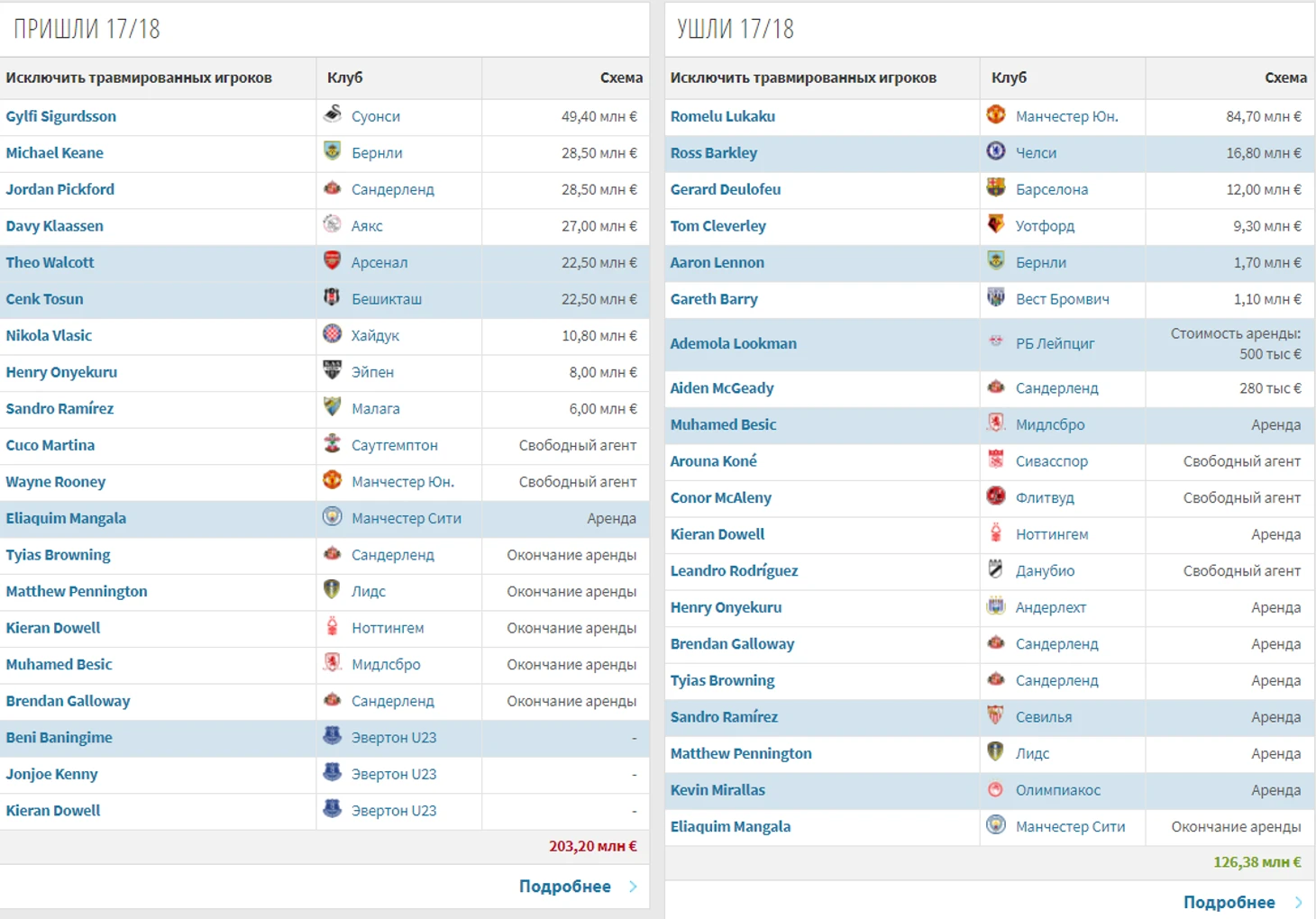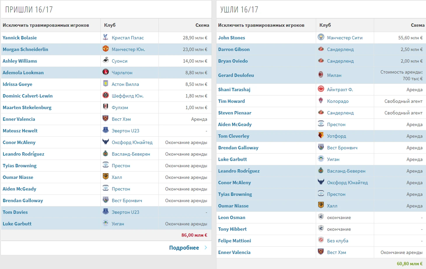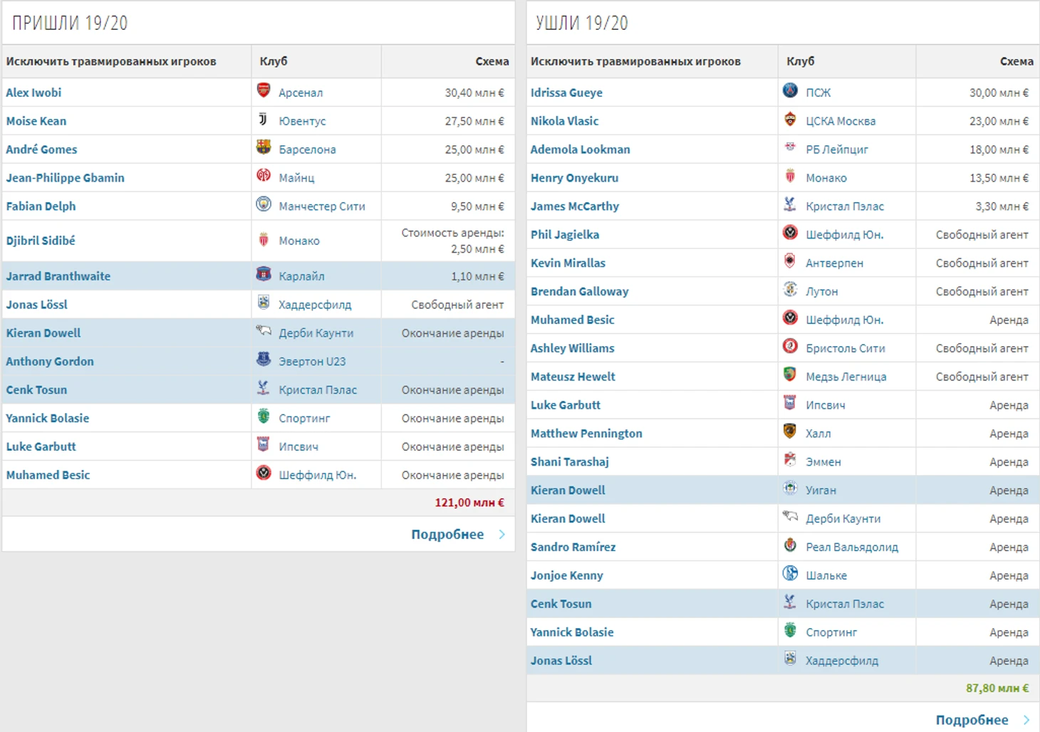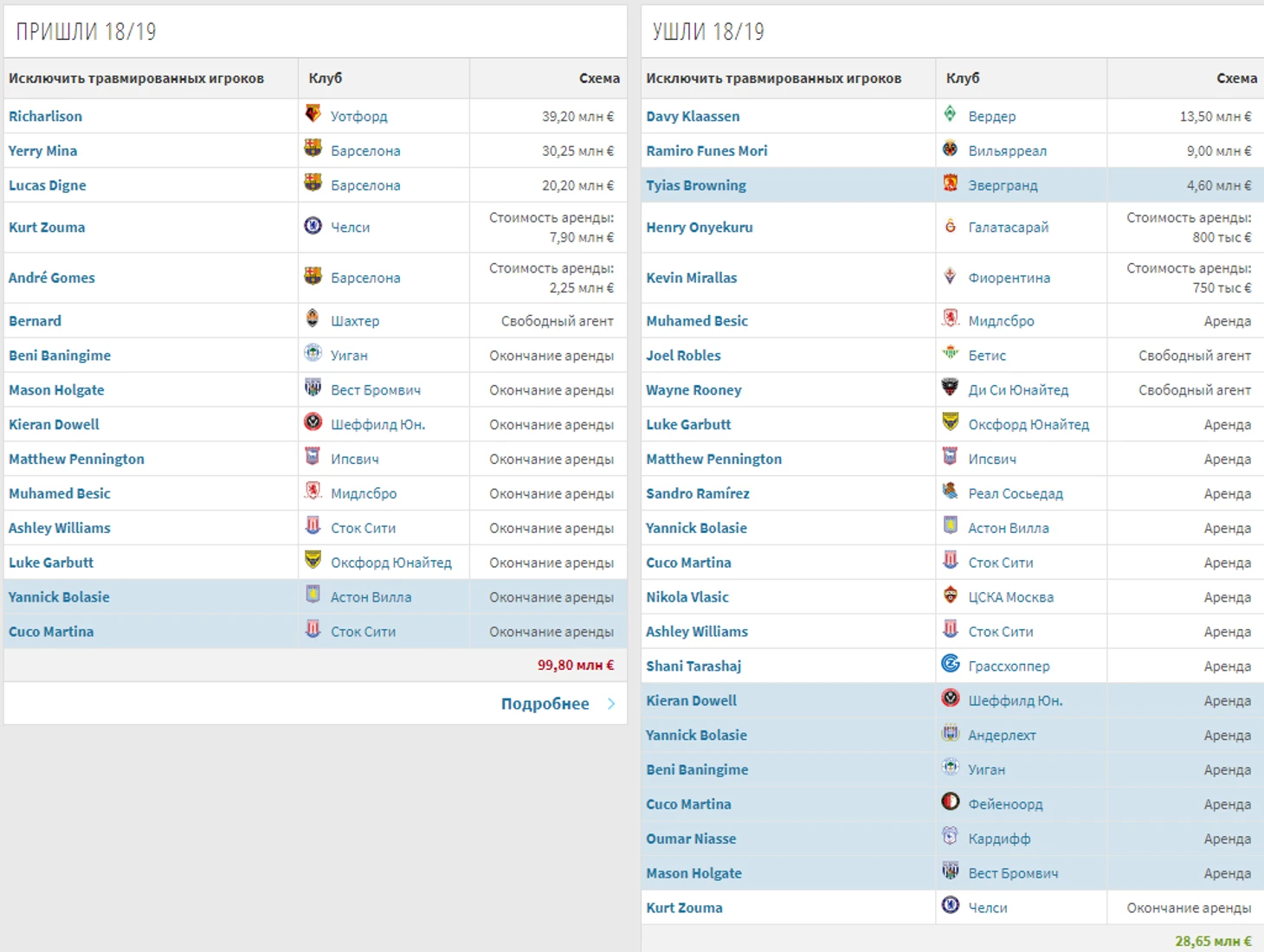 Качественных усилений, как видно в итоге, было произведено два - это сенегальский опорник Идрисса Гана Гуйе (в своё время он был лучше любого опорника по отборам и по игре - только Нголо Канте мог с ним посоревноваться по этой части, а Уилфрид Ндиди был хуже Ганы) и английский нападающий Доминик Калверт-Льюин. Провальными трансферами были три, и они самые дорогие - это конголезский вингер Янник Боласи, не закрепившийся сразу на Гудисон Парк, французский полузащитник Морган Шнедерлин, ставший эдакой обузой для команды на следующие 3 сезона, а также валлийский защитник Эшли Уильямс, который в сезоне 17/18 полностью провалился, и его карьера в высшем английском дивизионе подошла к концу.