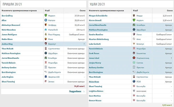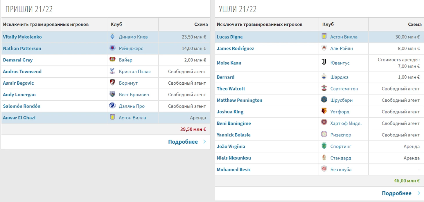 Из-за того, что в сезоне 20/21 не было дорогих продаж, в нынешнем сезоне не было возможностей укрепиться стояще. Летом были подписаны Демарай Грэй и Андрос Таунсенд, блиставшие в начале сезона, но сейчас, как и весь Эвертон, не впечатляют. Также были взяты два вратаря - Асмир Бегович и Энди Лонерган. Один подменяет Пикфорда, другой не понятно зачем был подписан. И ещё было одно приобретение - Хосе Саломон Рондон. Это смешной трансфер. Во-первых, был подписан в последний день трансферного окна (для чего, для кого). Во-вторых, он уже не тянет уровень клуба АПЛ даже для обоймы. И в-третьих, у нас итак раздута ситуация по зарплатам в команде (один Ивоби чего стоит). И не будем забывать про погоню за правым защитником всё лето - то Дензел Дюмфрис, то Макс Ааронс ежедневно всплывали в новостях, связанных с Эвертоном.