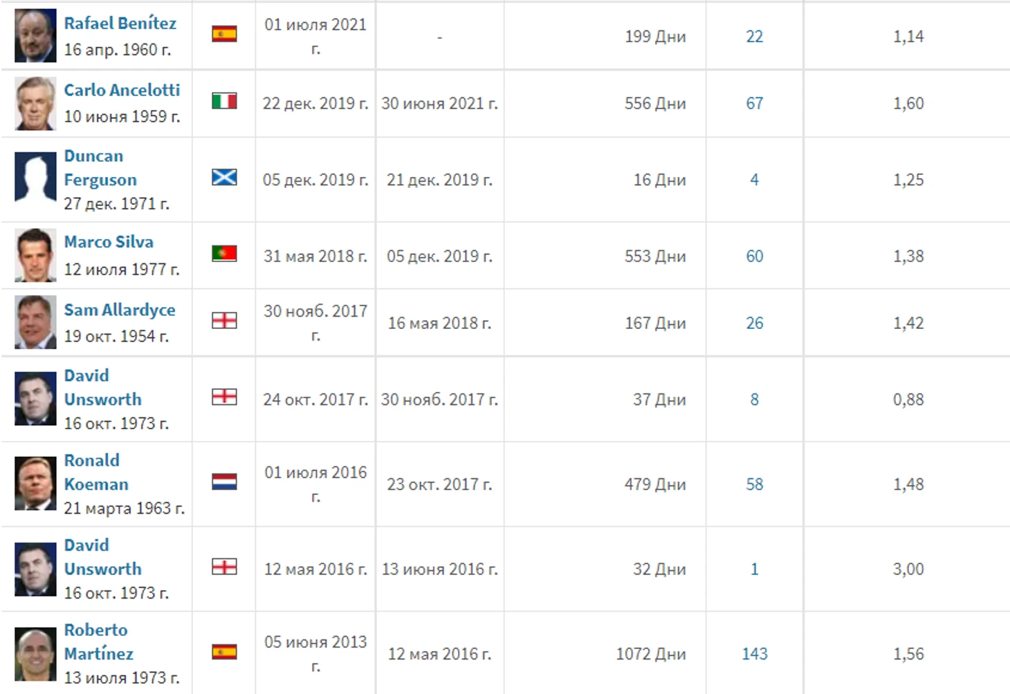 Начало сезона 2021/2022. 1 июня Эвертон прощается с Карло Анчелотти. Ему пришло предложение от самого Флорентино Переса. Итальянца позвали в Реал Мадрид - нужно сменить ушедшего отдохнуть (или же ждать предложений от сборной Франции или ПСЖ) Зинедина Зидана. А ведь Карло ещё не выигрывал чемпионат Испании. Да и как тут откажешь старине Фло? В общем, обе стороны пожелали удачи, президент "королевского" клуба выплатил солидную компенсацию за итальянца, а руководство Эвертона в лице Фархада Мошири, Билла Кенрайта и Дениз Баррет-Бексейндел приступило к отбору кандидатов на пост главного тренера "ирисок". Также в мероприятии по поиску коуча участвовал и спортивный директор Марсель Брандс, находившийся на своём посту уже четвёртый сезон к ряду. Ходило много слухов, обсуждалось много имён в британских газетах, однако пришли к общему решению - назначить главным тренером испанского специалиста Рафаэля Бенитеса, который до этого работал в китайском Далянь Ифан (это тот самый клуб, где играли такие футболисты, как Марек Гамшик, Янник Феррейра Карраско, а также "любимчик" последних лет для Рафы Хосе Саломон Рондон, известный по выступлениям в Рубине и Зените).