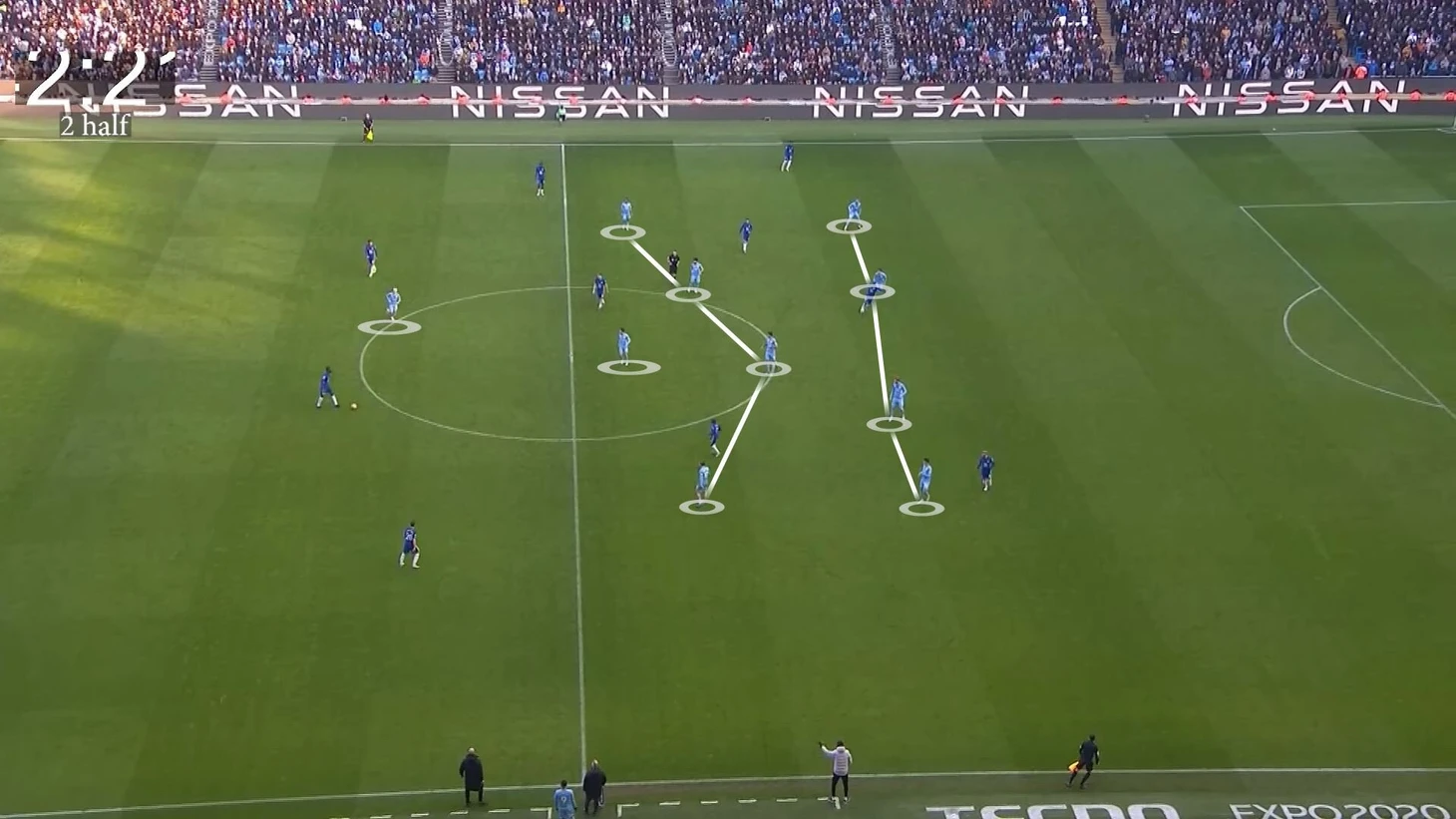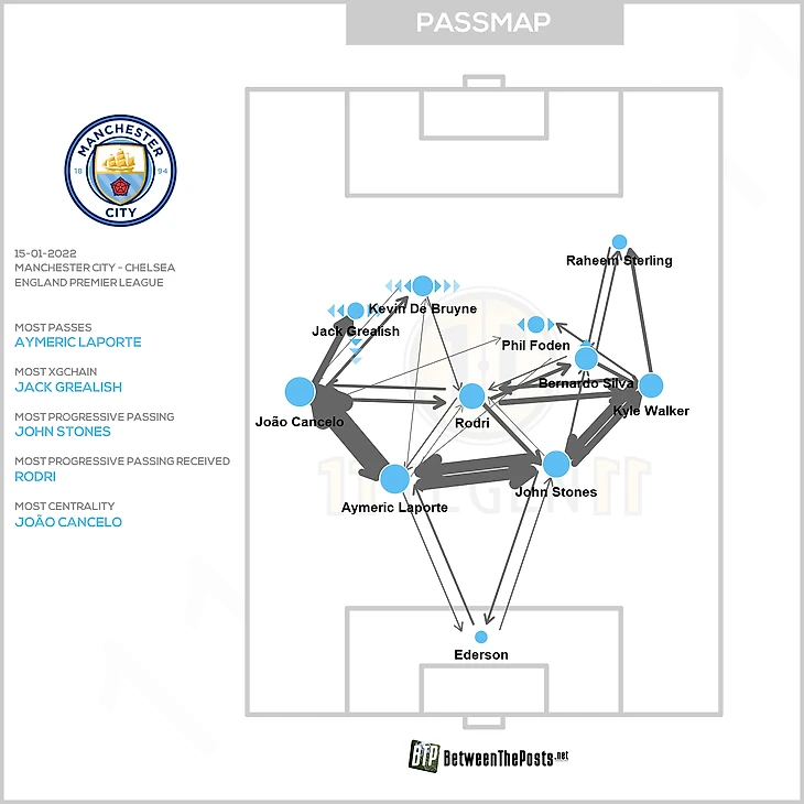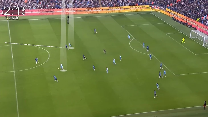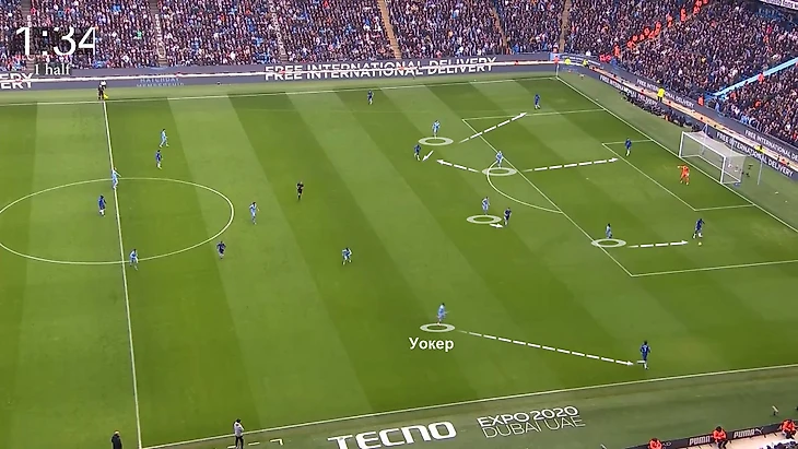 Второй – в обратной ситуации, когда «Челси» не садится в 5-4-1, свободу могли получать фланговые защитники Канселу и Уокер. В такие моменты центральный защитник максимально выманивает оппонента, а потом передает мяч свободному латералю. Опять-таки возникает ситуация для прямого обострения в последнюю линию (там специально под это открывались Стерлинг, Грилиш, Фоден и даже КДБ из глубины):