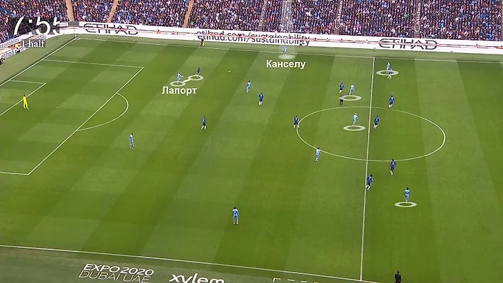 Один тип обострений все-таки Гвардиола оставил. Он сводился к перебрасыванию мяча через центр поля. Было несколько вариаций. Первая – «Сити» контролирует мяч, пока «Челси» не сядет в схему 5-4-1 (то есть Лукаку останется без поддержки). Потом находят свободного центрального защитника (в этом случае Лапорт), который пытается обострить, напрямую доставляя мяч в последнюю линию: