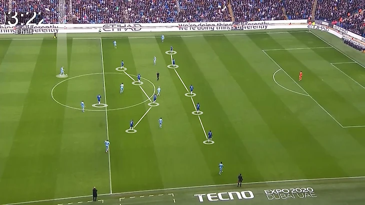 «Сити» показал иной тип сдерживания соперника. Хозяева не садились к штрафной, но уже играли без агрессивного прессинга. Оборонялись через компактный средний блок. Как правило, использовали схему 4-4-1-1: