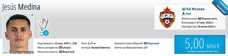 Портал статистики Transfermarkt включил игрока сборной Парагвая Хесуса Медину в состав ЦСКА.