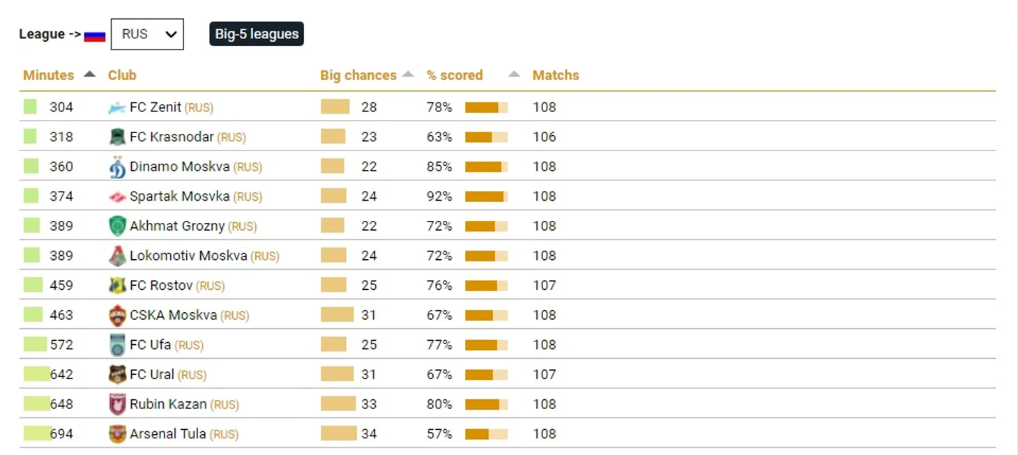 Причем статистика доступна не только для команд топ-5 чемпионатов, но и для РПЛ.