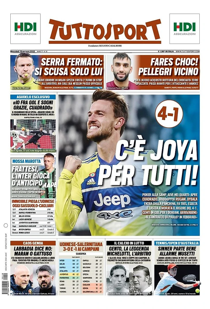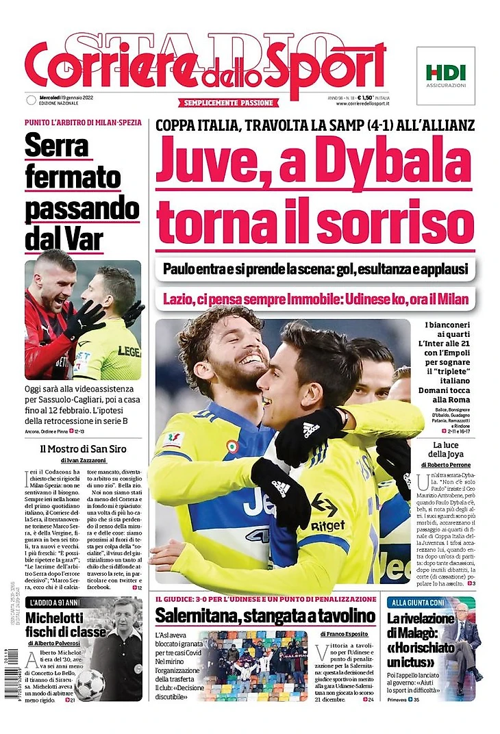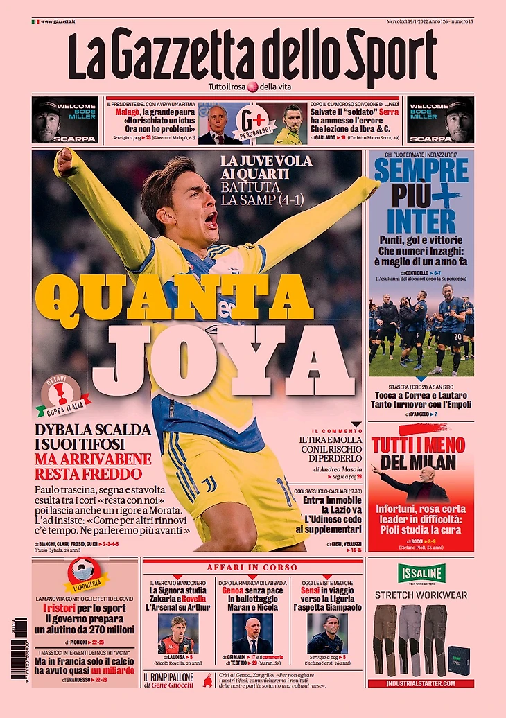 «Сколько Радости» – отмечает победу Бьянконери в Кубке Gazzetta: «Юве» летит в четвертьфинал, побеждена «Самп» (4:1). Дибала разогревает своих болельщиков. Но Арривабене остаётся холодным. Пауло тащит, забивает и на этот раз празднует под кричалки «оставайся с нами», затем оставляет пенальти Морате. Генеральный директор настаивает: «Как и для других продлений, есть время. Мы поговорим об этом позже». Также Gazzetta упоминает и о возможны трансферах Бьянконери: «Арсенал» нацелился на Артура. Если он уйдёт, придут Закария или Ровелла».