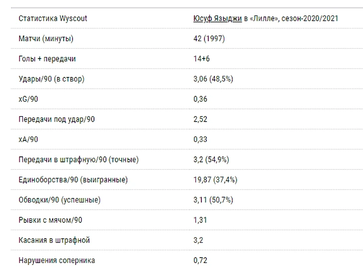 Однако нынешний период может вводить в заблуждение. В прошлом сезоне чемпионата Франции Языджи наоборот был одним из самых эффективных игроков команды. Он стал лидером «Лилля» по NPxG + xA в пересчете на 90 минут (ожидаемые голы без учёта пенальти и ожидаемые передачи) с показателем 0,69. Также занял первое место по ключевым передачам (3,03), по ударам (3,70) и по xGChain (0,71). Последняя метрика оценивает вклад в игрока во все атаки, завершившиеся ударами. Безусловно, здесь важен контекст: из 32 матчей Языджи лишь в 10 случаях выходил в стартовом составе, он набрал только 1185 минут в чемпионате. И его самые сильные в команде цифры – в том числе следствие «эффекта запасного». Но не только. Был мощнейший отрезок с октября по февраль, когда Юсуф показывал очень крутой и эффективный футбол. В таблице от Wyscout снизу – немного другие данные. В ней берётся не только чемпионат Франции, но и другие клубные турниры – Кубок Франции и Лига Европы. В последней, кстати, были два хет-трика – в матчах с «Миланом» и «Спартой».