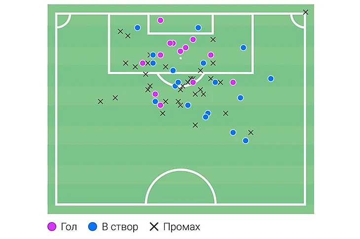 Много ударов и передач под удар, солидный xG+xA – Языджи был эффективен во всех турнирах. А вот для наглядности карта ударов Языджи. Как видим, он забивает с самых разных дистанций, в том числе издали.