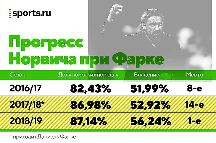 «Норвич» – отличный пример того, как это работает на пике, и того, как это не работает в процессе перестройки (первый сезон с 14-м местом). Узнаваемость и фундамент появились сразу. Но результат пришел только после преобразования состава под Фарке.