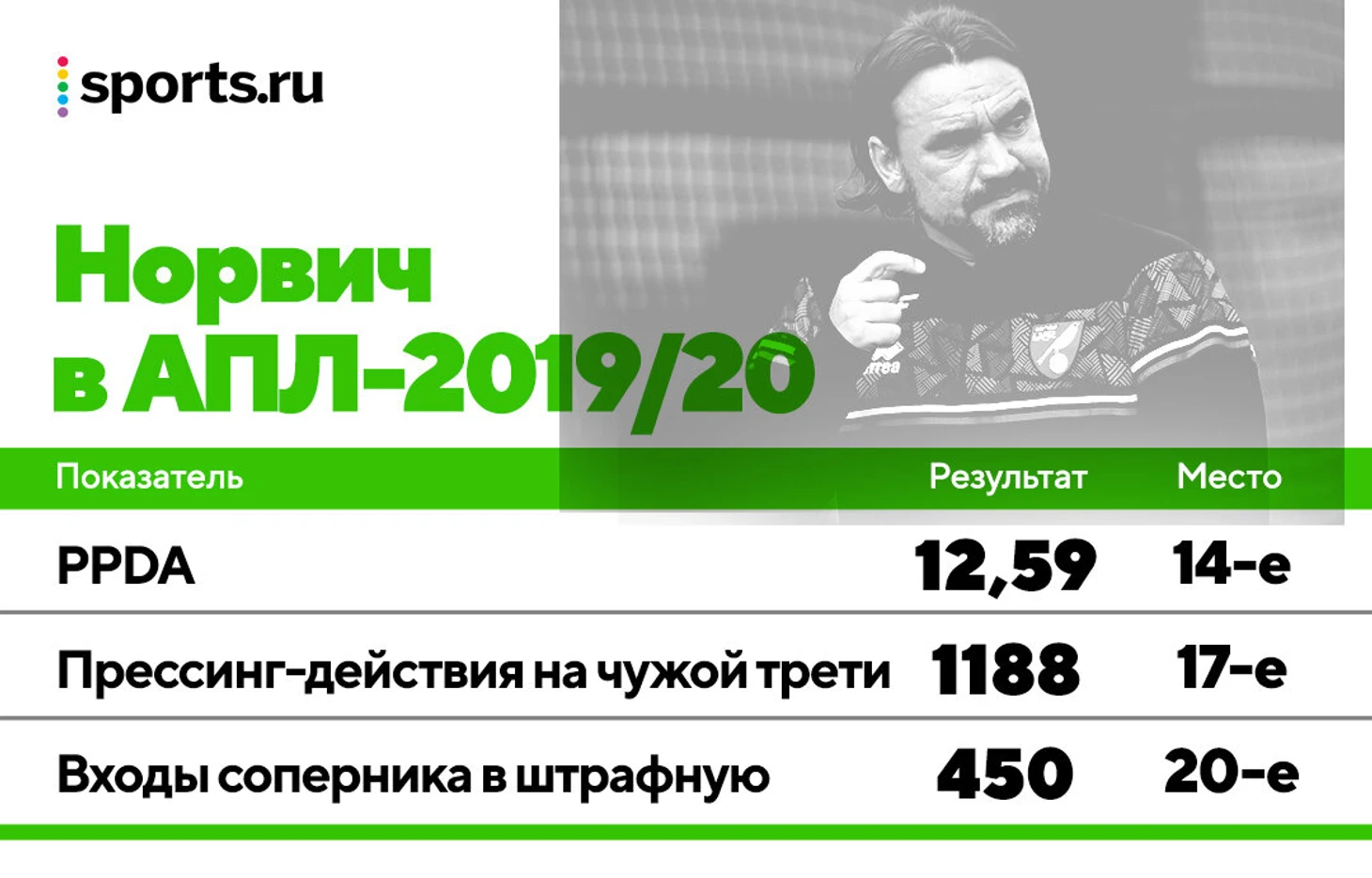 Рассмотрим его полный сезон в Премьер-лиге в контексте прессинга: «Норвич» был 14-м по интенсивности (PPDA) и 17-м по прессинг-действиям на чужой трети. У команд, которые даже не пытаются прессинговать, схожие цифры.