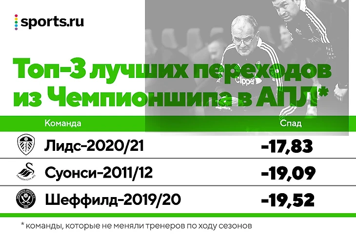 Частая, но ошибочная теория: атакующий стиль труднее переносить на более высокий уровень. Это излишняя генерализация (атакующие стили бывают разными). В топ-3 лучших переходов из Чемпионшипа в АПЛ – «Лидс» Марсело Бьелсы и «Суонсилона» Брендана Роджерса. Плюс «Шеффилд Юнайтед», который нельзя отнести явно к атакующему полюсу, но который в первый сезон запомнился яркими рывками центральных защитников до чужой штрафной: