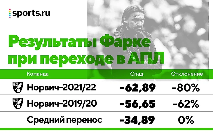 Показатели Фарке – 57 очков и 63 очка (ритм до увольнения на старте этого сезона). Это огромное отклонение. То есть команды Фарке переносили результаты на 62% и 80% хуже средней команды. Еще раз: не выступают на 62% и 80% хуже, чем в Чемпионшипе, а именно переносят результаты – прогнозируемый спад уже учтен, а эти проценты – налог стиля и слабых сторон Фарке.