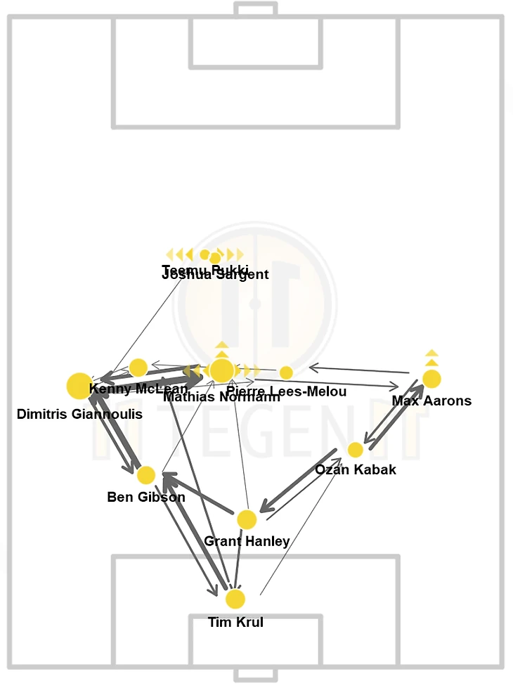 Типичная карта передач «Норвича» Фарке против топ-соперника выглядит так – настаивают на коротких розыгрышах, но не могут выбраться со своей половины (часто даже трети). Вот пример из этого сезона против «Ливерпуля»:
