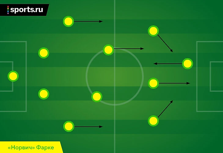 В Чемпионшипе риск от коротких розыгрышей оправдывал себя, так как они были базисом опасных позиционных атак. Ситуация, в которой «Норвич» больше создаст, чем допустит контратак, была вероятной – и Фарке реализовывал ее на практике. В АПЛ же по описанным причинам «Норвич» не следовал позиционным принципам (ширина от крайних защитников – их важный элемент) – и лишался даже потенциальных плюсов, но все равно упорно отказывался упрощать игру.