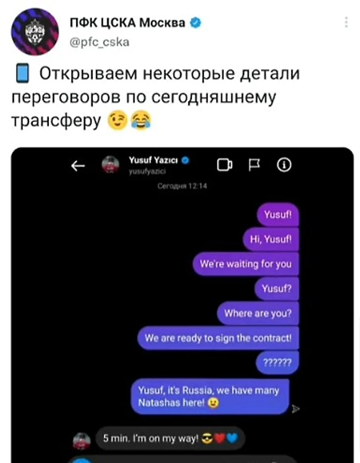 Для тех, кто выпал из инфополя спортивного контента, обрисую вкратце: футбольный ЦСКА решил оригинально подойти к анонсированию подписания контракта с турецким игроком Юсуфом Языджи. В своих соцсетях они представили его переход из французского «Лилля» в виде переписки, где армейцы безуспешно зазывали Юсуфа, но он не реагировал. До тех пор, пока ЦСКА не сделали ему главный оффер – написали, что в России его будут ждать «много Наташ». После чего нам показывают моментальную реакцию и согласие Юссуфа на подписание контракта.