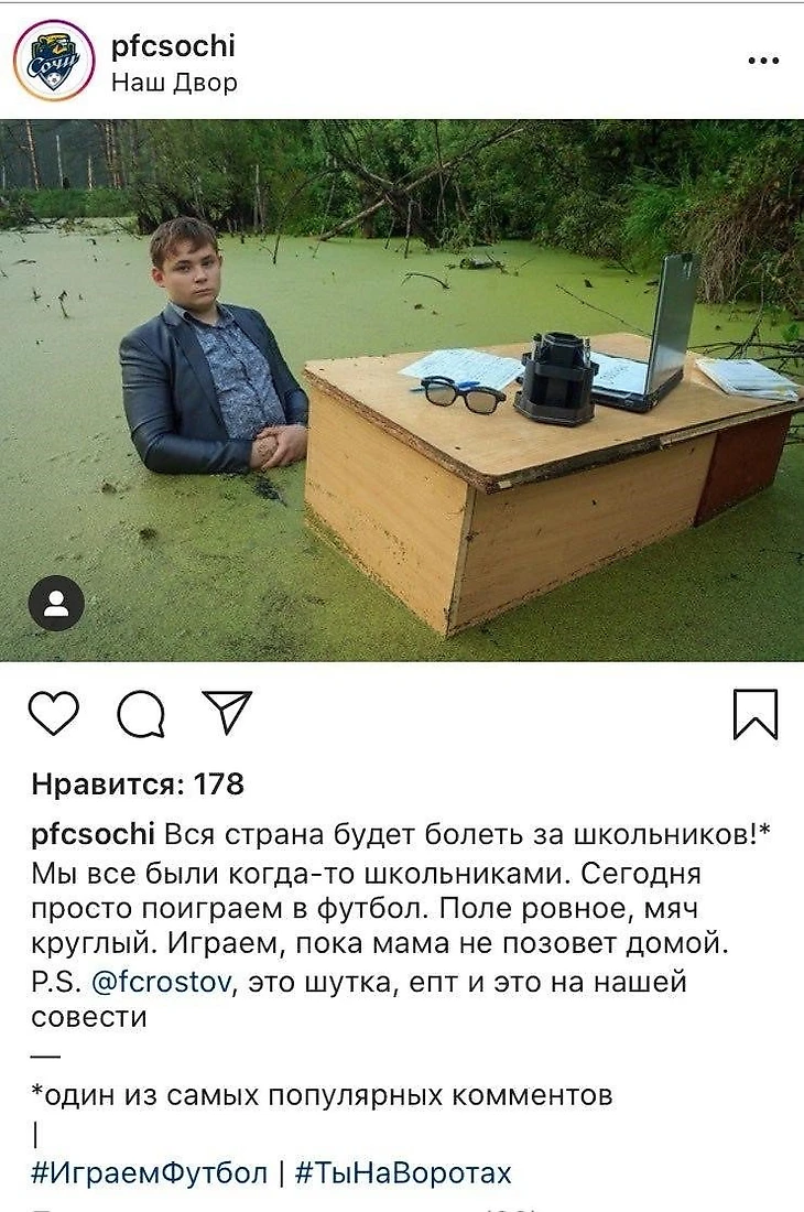 Ещё годом ранее, когда российский футбол пребывал в посткарантинном состоянии, генерацией инфоповода к матчу с и так повышенным вниманием отметились SMM-щики «Сочи». Напомню, тогда в туре встречались «Сочи» и «Ростов», у которого основной состав команды заболел коронавирусом, и клуб был вынужден ставить в состав юных воспитанников. Средний возраст того состава ростовской команды составил 17 лет. «Сочи» не придумал ничего лучше, как анонсировать матч картинкой школьника, сидящего в болоте, подписав: «Мы все были когда-то школьниками - играем, пока мама не позовет домой».