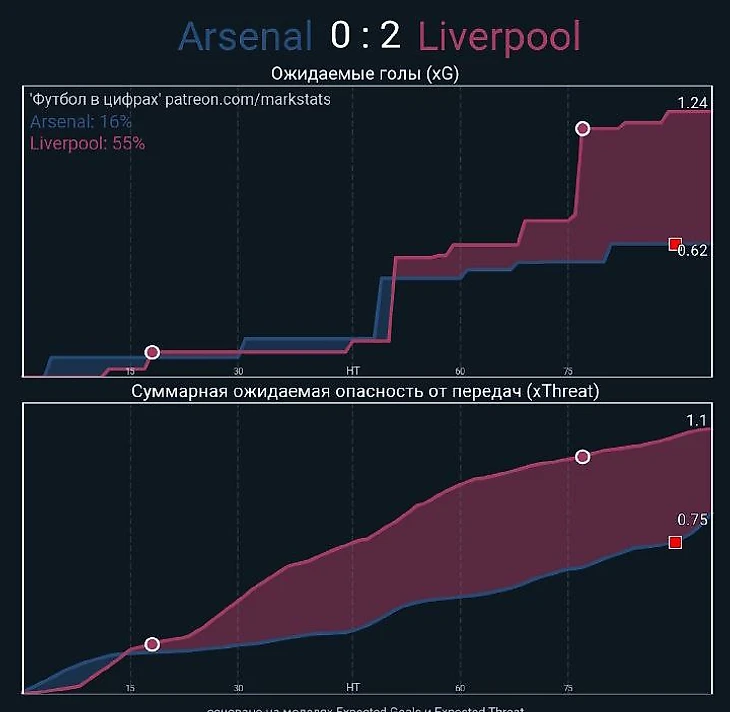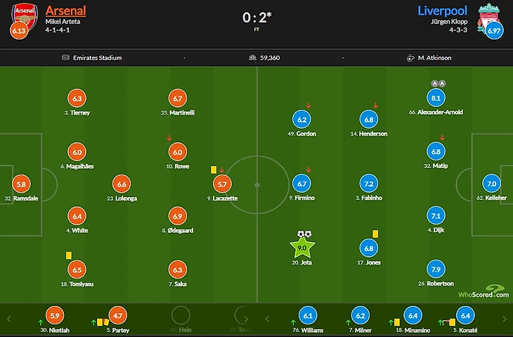 Арсенал предсказуемо пытался давить через свой левый фланг, ожидая высокого расположения от игроков Ливерпуля, но Клопп оказался на шаг впереди, а вовремя изменить атакующую модель у Артеты не вышло. Сака раз за разом проигрывал в силовой борьбе Ван Дейку и Фабиньо, а Локонга явно не вывозил роль единственного якоря, что привело к подрезке крыльев Смита-Роу и Эдегора. Эмиль и Мартин были вынуждены поочередно становится на позицию второго разрушителя при переходе на схему 4231, но это было настолько критическим фактором для атаки, что Пушкари не смогли толком создать никакой ощутимой остроты.