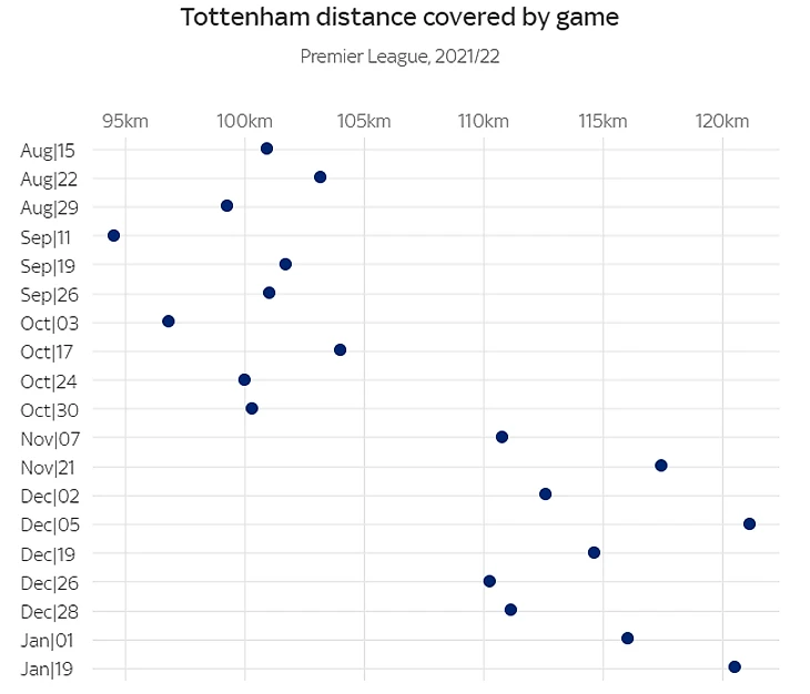 Тоттенхэм опережал своих соперников во всех девяти играх лиги с ноября, а 121,1 км, которые они преодолели против Норвича, стали самым большим расстоянием среди всех команд в АПЛ в этом сезоне.