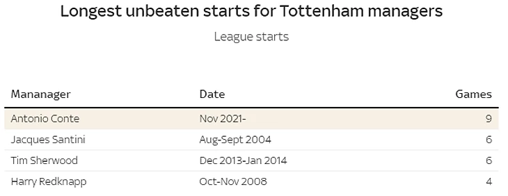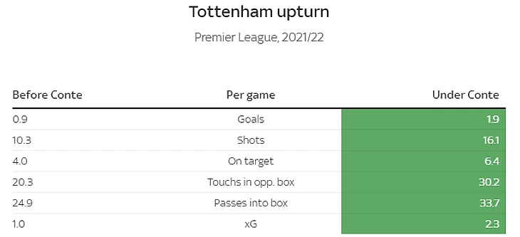 Улучшение Тоттенхэма под руководством Конте как в нападении, так и в обороне привело к впечатляющему результату в 21 очко в девяти играх под его руководством. Больше очков за такое же количество матчей (24) набрал только безудержный лидер таблицы Манчестер Сити.
