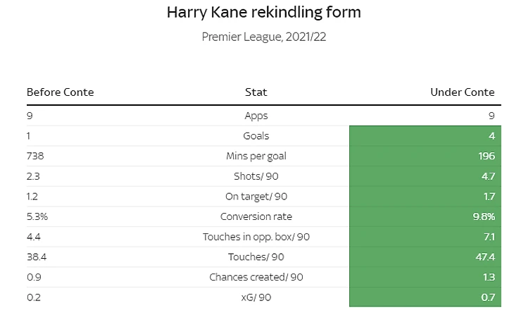 Кейн — лучший бомбардир Тоттенхэма во всех соревнованиях под руководством итальянца, имея на счету 6 забитых голов: 4 — в АПЛ, и все в последних пяти играх. До назначения Конте Кейн забил всего 1 гол в девяти матчах чемпионата. Он стал чаще и острее бить по воротам, улучшив показатели не только реализации, но и общей игры в штрафной соперника.