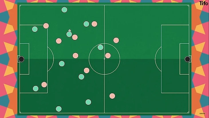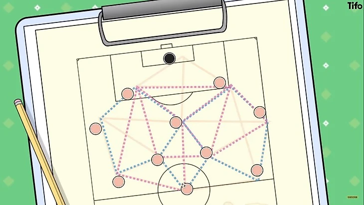 Игрокам необходимо перемещаться относительно того, где находится мяч, чтобы поддерживать существующие линии для передачи и создавать новые, особенно когда противник прессингует высоко, чтобы перекрыть их.