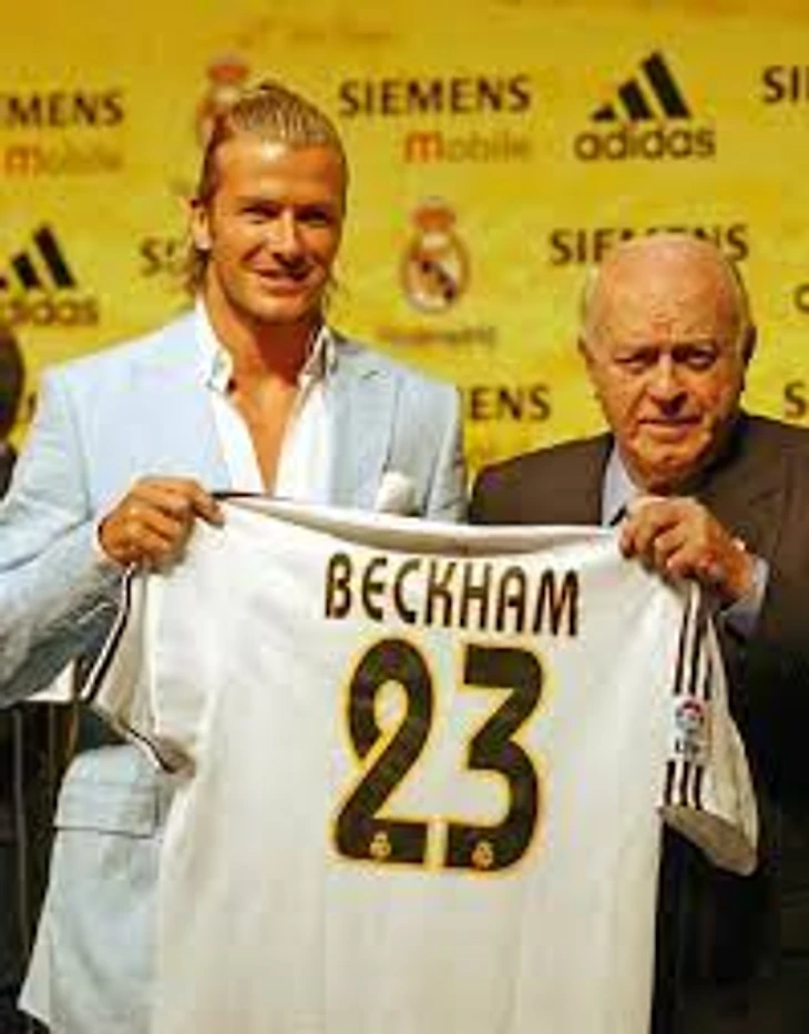 Началась карьера англичанина в Испании с победы в Суперкубке над «Мальоркой», причём во втором поединке из двухматчевой серии, состоявшемся 27 августа 2003 года, Бекхэм открыл и счёт своим голам за новый клуб, поразив ворота соперника на 73-й минуте и установив окончательный счёт (3:0). Дэвиду не потребовалось время, чтобы адаптироваться в новых условиях: с первых же матчей он стал органичным элементом команды звёзд. Дебютный гол за «Реал» в рамках чемпионата он забил на 3-й минуте дебютного же поединка, а всего в первых 16 матчах Ла Лиги отметился пятью забитыми голами. Резво начавшийся сезон закончился, однако, лишь четвёртой строчкой в Примере и поражением в финале Кубка Короля от «Сарагосы» (2:3; Бекхэм открыл счёт в матче). Не соответствовал ожиданиям и результат «галактикос» в Лиге чемпионов: «Реал» вылетел на стадии 1/4 финала, совокупно уступив будущему финалисту «Монако» (4:2 и 1:3) из-за меньшего количества голов, забитых на выезде. Начало сезона 2004/05 была ознаменовано серией тренерских отставок: сначала Карлуша Кейроша сменил Хосе Антонио Камачо, продержавшийся в команде лишь три недели, затем назначенный вместо него Мариано Гарсия Ремон уступил бразильцу Вандерлею Лушембургу. На осенний кризис в клубе наложилась и неприятная история с участием Бекхэма на уровне международном: в матче против сборной Уэльса Бекхэм был грубо атакован защитником Беном Тэтчером и, осознав, что получил серьёзную травму, отомстил валлийцу, пойдя на сознательный фол против него и удостоившись за это дисквалификации на следующий матч. Об умышленности своих действий англичанин признался 12 октября 2004 года, на следующий день после матча, вызвав неоднозначную реакцию у общественности: «Я специально шёл на тот фол. Уверен, что некоторые считают, что у меня просто не хватило бы мозгов на такой поступок, однако мозги у меня есть. Я знал, что травмирован серьёзно, так что я сбил Тэтчера. Я и раньше такое делал. Понимая, что всё равно несколько недель играть не буду, я решил заодно и жёлтую карточку получить, чтобы дисквалификация пришлась на те матчи, в которых я и так играть не буду». 13 октября Бекхэм извинился за свои «ошибочные» действия перед Футбольной ассоциацией Англии, ранее потребовавшей объяснений от футболиста, а также перед болельщиками и партнёрами по сборной, и добавил: «Хочу лично извиниться перед главным тренером Свеном-Ёраном Эрикссоном. Я знаю, что как капитан сборной должен соблюдать принципы честной игры». Вскоре он был дисквалифицирован и в чемпионате Испании, получив вторую жёлтую карточку за саркастические аплодисменты в адрес главного арбитра в матче против действующего чемпиона, «Валенсии»; дисквалификация, впрочем, была снята по апелляции. К концу календарного года «Реалу» удалось подняться с восьмого места, занимаемого командой в конце сентября, на второе. Выше второй строчки команда в данном сезоне уже не поднялась, а из Кубка Короля была выбита «Вальядолидом» ещё на стадии 1/8 финала. На той же стадии завершили Бекхэм и компания своё выступление в Лиге чемпионов, уступив «Ювентусу» (1:0 и 0:2).