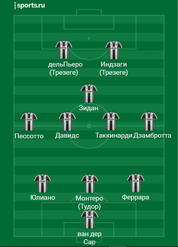 Анчелотти играл по двум схемам: 3-4-1-2 и 4-4-2 с ромбом. Кроме упомянутого трио, в основе можно увидеть таких значимых для клуба персон, как Антонио Конте и Джанлуку Пессотто, бравших ЛЧ-96, а также Эдвина ван дер Сара, чья карьера в Турине откровенно не задалась. Команду ждало возвращение Липпи и большие перемены составе. Зидан уйдет за фантастические деньги в Реал, а боссы клуба очень грамотно ими распорядятся, прикупив Буффона, Тюрама и Недведа. От этой сделки определенно выиграли все стороны.