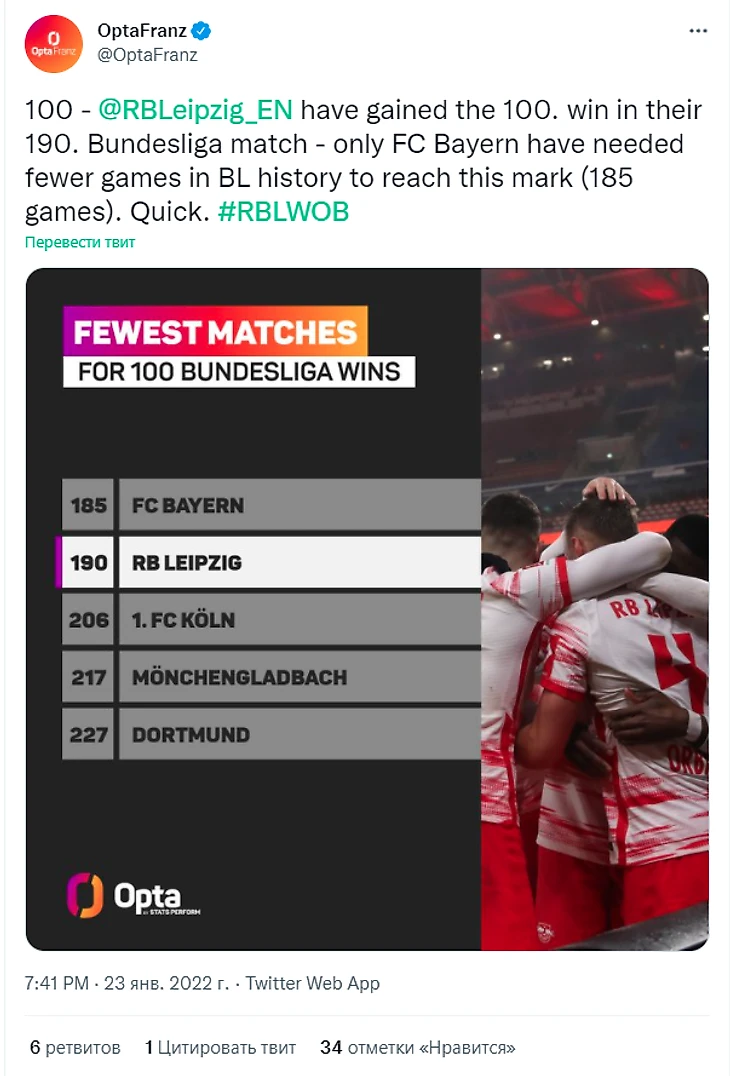 «Лейпциг» отпраздновал 100-ю победу в своей истории Бундеслиги (в 190 играх). Только «Бавария» преодолела эту отметку быстрее (в 185-й игре).