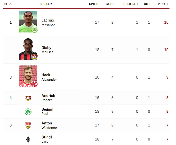 *игрок – кол-во игр – желтые – 1+1 желтые – красные – всего