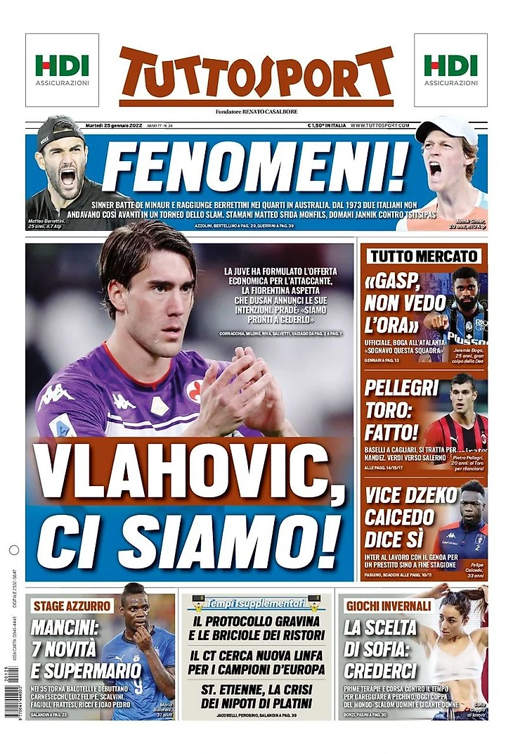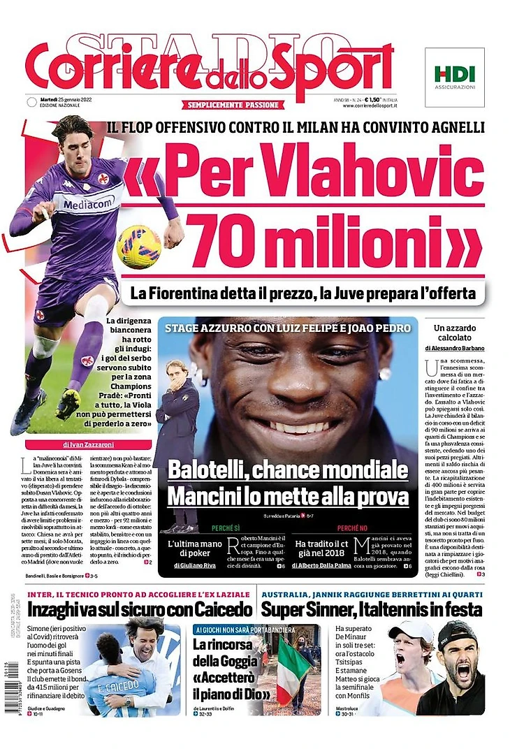 «За Влаховича 70 миллионов» – пишет о трансфере и Corriere, уточняя главную его причину: «Атакующий провал против «Милана» убедил Аньелли. «Фиорентина» объявила цену, «Юве» готовит предложение. Руководство Бьянконери не стали ждать: голы серба нужны сразу для зоны Лиги Чемпионов. Праде: «Готовы ко всему, «Фиалки» не могут позволить себе терять его бесплатно».