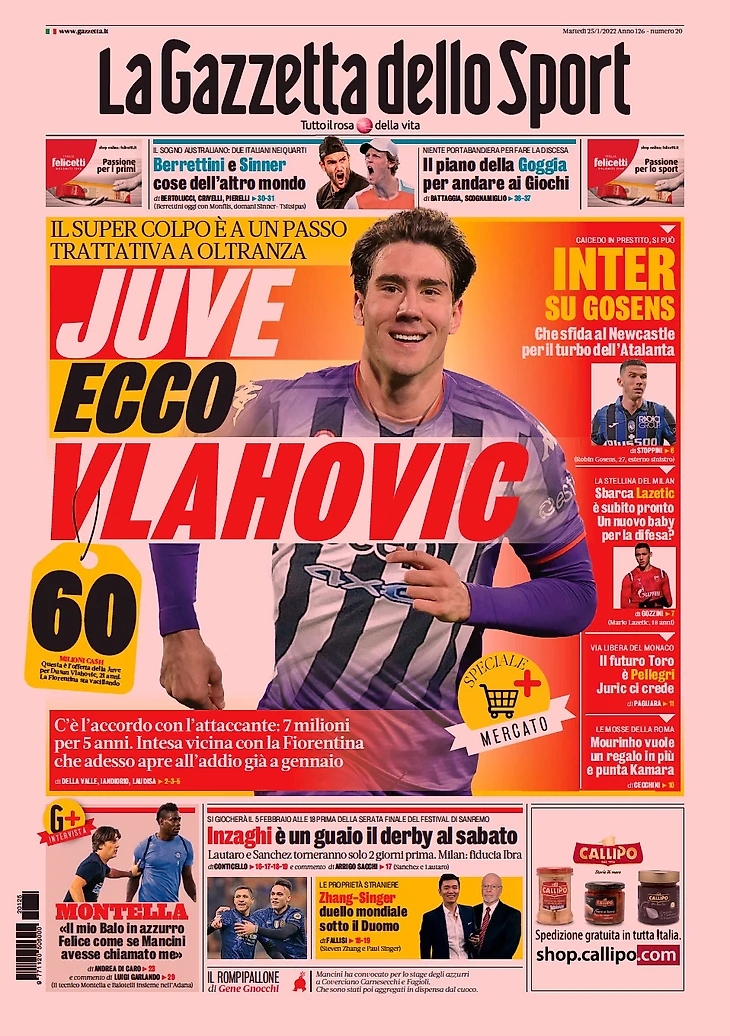 «Юве», вот Влахович. Заголовки Gazzetta, TuttoSport и Corriere за 25 января