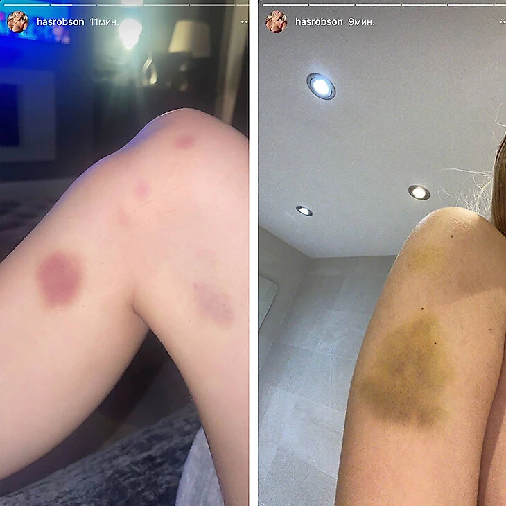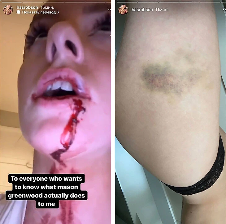 В воскресенье девушка Гринвуда Хэрриет Робсон выложила в сторис инстаграма жуткие фото. У нее сильно разбита губа, а также много гематом разного размера: на руках, ногах и лице. В одной из сторис Робсон пишет: «Для всех, кто хотел знать, что Мэйсон Гринвуд на самом деле делает со мной».