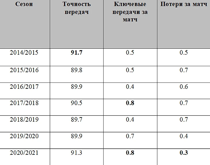 Что касается показателей по игре с мячом, то здесь сохраняется высокий уровень каталонца, так как эти действия в большей степени требуют наличия высокого игрового интеллекта, которым, без сомнения, Бускетс обладает.