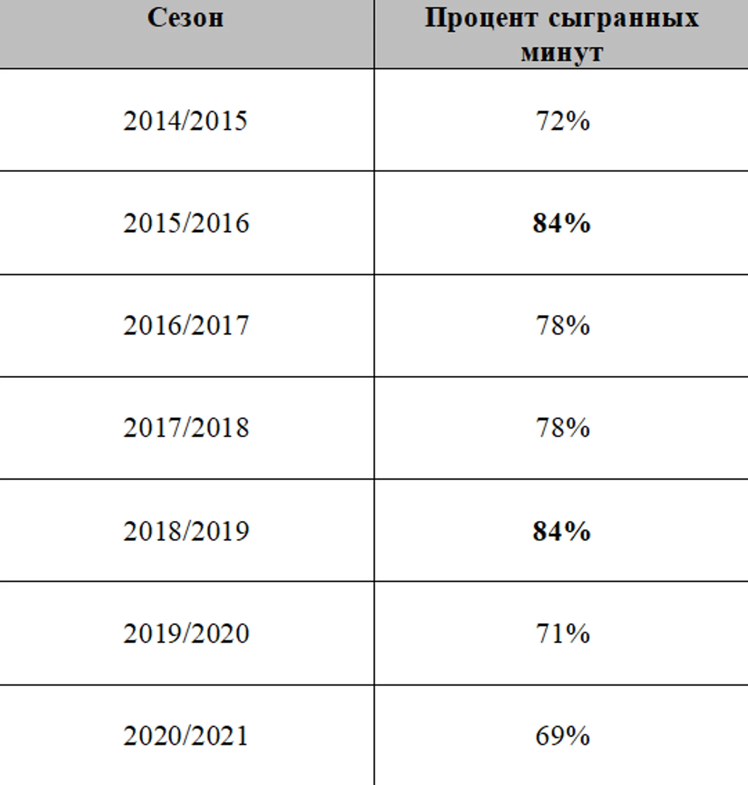 Необходимо обратить внимание на время, проводимое игроком на поле. Бускетс достаточно редко получает серьёзные травмы, поэтому эти данные могут наглядно оценить уровень доверия каталонцу со стороны тренеров.