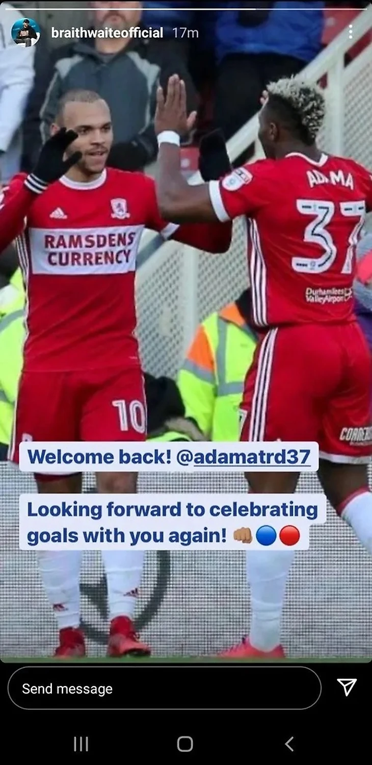 «С возвращением, Адама Траоре! С нетерпением жду возможности снова отпраздновать гол вместе с тобой!», - написал Брейтуэйт сториз в Instagram.