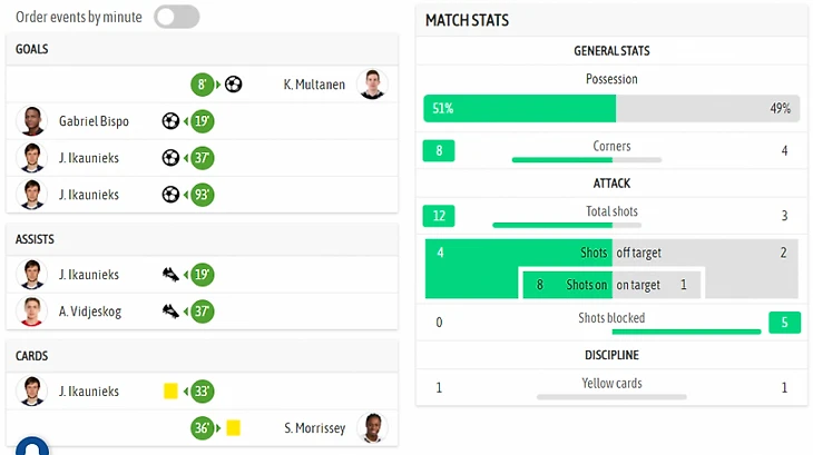 Первый тайм так и завершился со счетом 2:1 и результат держался практически до окончания встречи, пока уже в добавленное арбитром время не отличился тот же Икауниекс. Латвийский футболист вырвался на оперативный простор, увидел, что голкипер соперника вышел далеко из ворот и ударом за шиворот тому с метров сорока отправил мяч в сетку. Окончательный итог матча – 3:1.