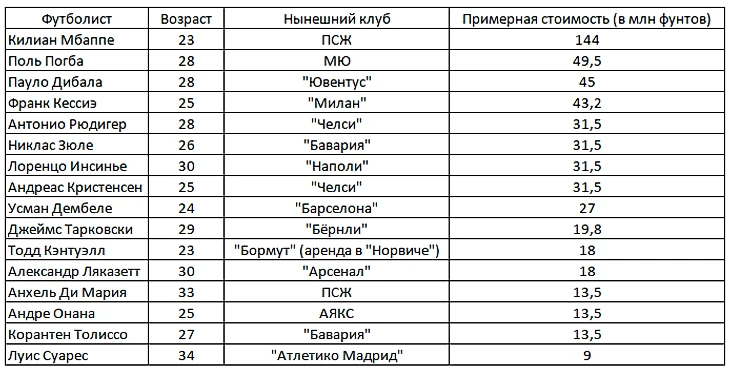 Самым дорогим потенциальным свободным агентом оказался нападающий ПСЖ Килиан Мбаппе, француза оценили в 144 млн фунтов.