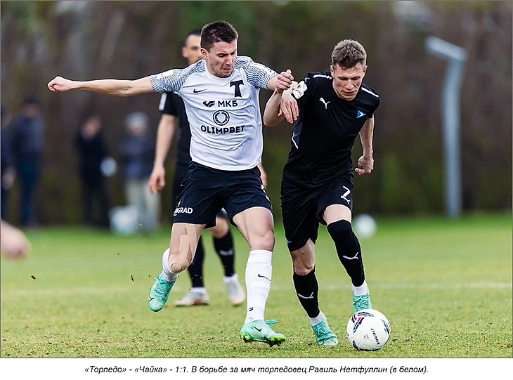 «ТОРПЕДО» Москва, Россия – «ЧАЙКА» Песчанокопское, Россия – 1:1 (1:0) Голы: 1:0 Каплиенко (6), 1:1 Елисеев (63). «Торпедо» (футболки - белые): 51. Ботнарь, 44. Самсонов - к (49. Прошкин, 61), 5. Шумских, 4. Кожемякин, 25. Каплиенко, 20. Померко, 52. Нетфуллин, 11. Темников (19. Цаллагов, 45), 9. Адаев (24. Дорохов, 74), 14. Султонов (21. Кравчук, 74), 55. Лаптев (90. Калмыков, 63; 15. Орехов, 79). Запасные: Довбня, Полубояринов. Тренер – А.Г.Бородюк. «Чайка» (футболки - чёрные): 86. Рыбиков, 29. Волков (24. Ивашин, 80), 4. Гаврилович - к, 23. Ужгин, 6. Гыстаров, 24. Синяк, 77. Орлов (9. Смирнов, 87), 7. Хохлачёв, 50. Елисеев, 21. Олейников, 11. Алиев. Запасные: Карташов, Грибанов, Мархолия. Тренер – Ташуев С.А. Удаления с правом замены: Темников (41), Самсонов (58), Калмыков (77). 01.02.2022 (вторник). Начало – 17:00. Лара (Турция). Тренировочное поле отеля Miracle.