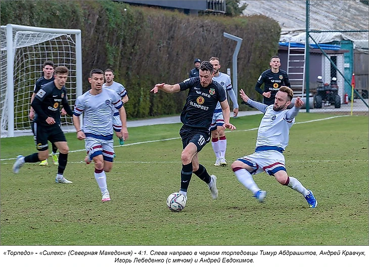 «ТОРПЕДО» Москва, Россия – «СИЛЕКС» Кратово, Северная Македония - 4:1 (0:0) Голы: 1:0 Лебеденко (53), 1:1 Стойчевски (57), 2:1 Маркин (73), 3:1 Маркин (81), 4:1 Лаптев (85). «Торпедо» (футболки - чёрные): 56. Довбня, 99. Евдокимов, 2. Бурлак, 49. Прошкин, 59. Абдрашитов, 17. Седько, 21. Кравчук (Орехов, 63), 97. Полубояринов (Цаллагов, 63),, 93. Маркин, 90. Калмыков (Лаптев, 61), 10. Лебеденко (Дорохов, 63). Запасные: Ботнарь, Кожемякин, Орехов, Цаллагов, Дорохов, Лаптев. Тренер – А.Г.Бородюк. 01.02.2022 (вторник). Начало – 11:30. Лара. Тренировочное поле отеля Miracle.