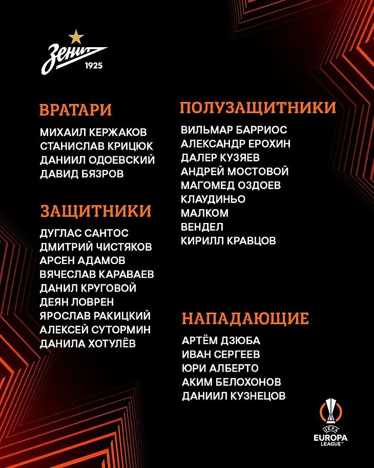 Адамов, Сергеев и Алберто — в заявке «Зенита» на плей-офф Лиги Европы