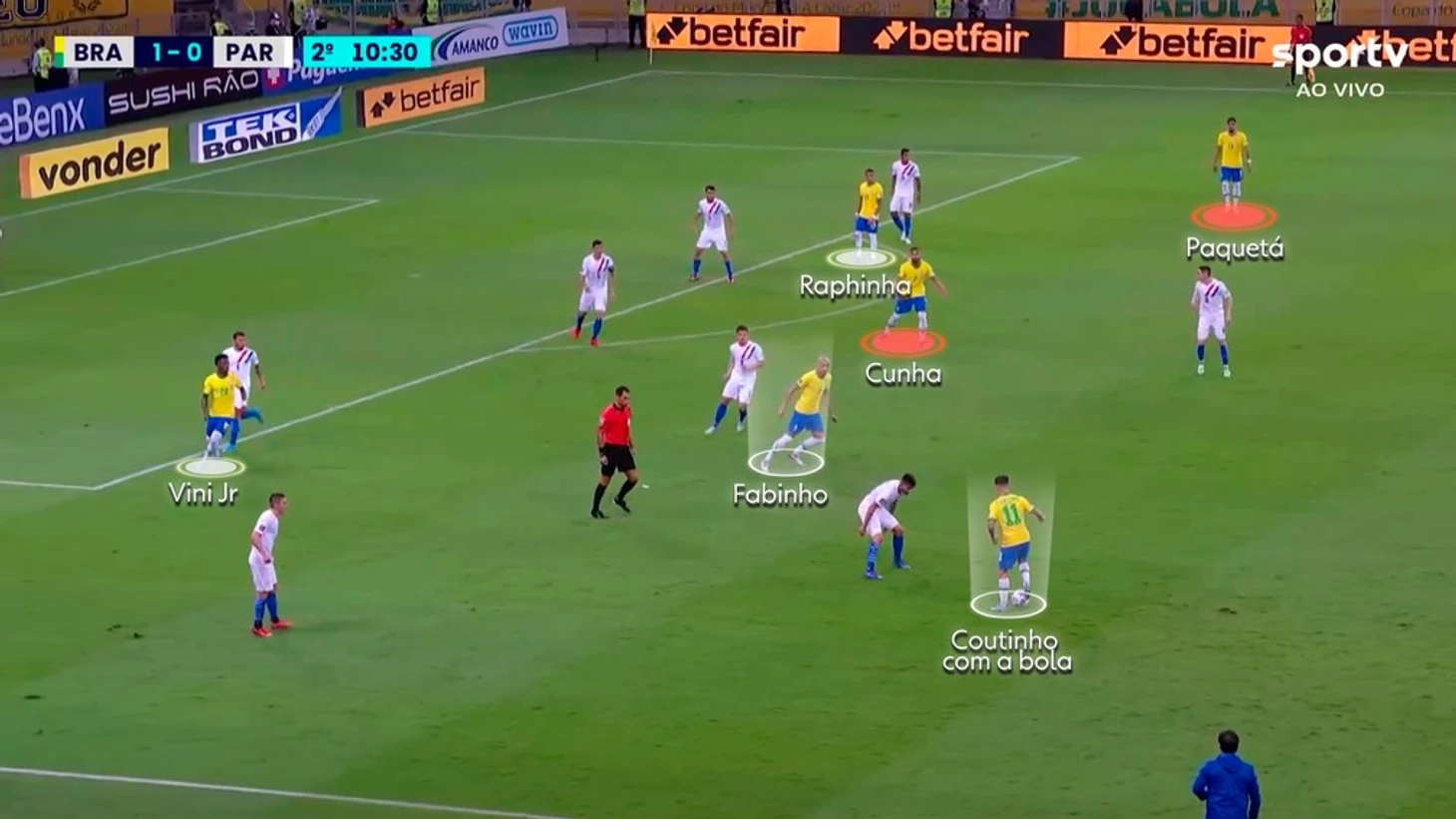 Бразильцы начали с места в карьер и уже на второй минуте Рафинья,огненно проведший всю игру, отправил мяч в сетку, судья уверенно показал на центр, но пока шел к центральному кругу, услышал голос свыше. Или это был ВАР. Так или иначе, но почему-то по пути свернул к телевизору и после пятиминутного просмотра увидел какое-то касание рукой у вингера «Лидса». Ни один ракурс правда однозначно это не подтвердил, но гол рефери решил отменить. То ли своя трактовка правил, то ли он просто аргентинец. Простим ему этот грех. Парагвайцы после возобновления игры провели наверное самую опасную атаку в матче - Самудио как от стоячего ушел от Алвеса и покатил по науке от лицевой по диагонали в штрафную. Вот только забыл, что Парагвай весь матч мучился в 4-5-1 и поддержки у него чисто физически не было, да и Фабиньо был тут как тут.