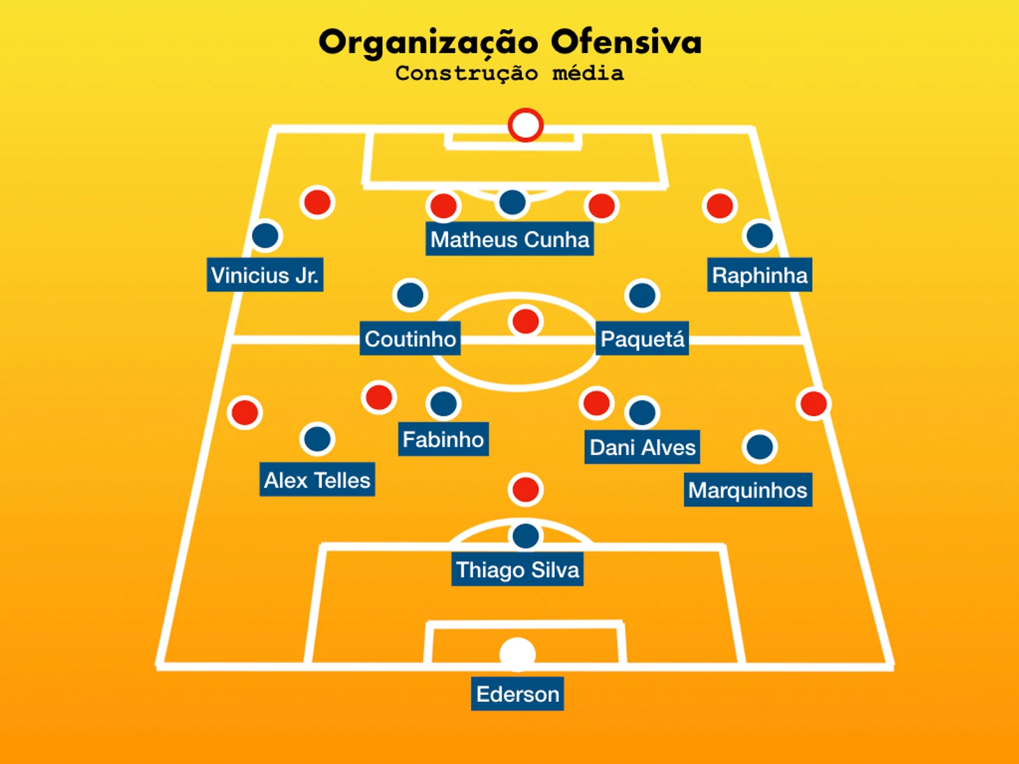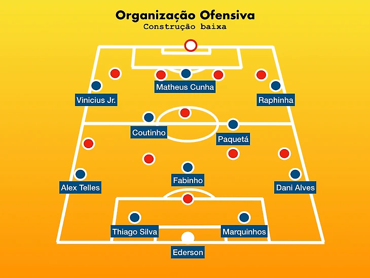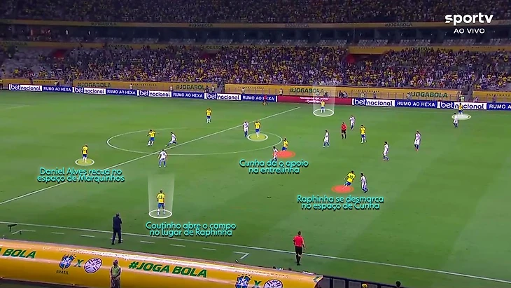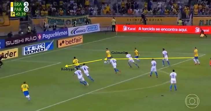 Против низко обороняющихся команд этот модуль действует стандартно плохо при соблюдении 2 условий - слабое движение, инертный поиск пространства пятеркой впереди и низкая точность отдающих, плохое их владение длинными передачами. Все то, что барахлило прошлым летом на Копе, но то во что так настойчиво поверил Тите и продолжает развивать теперь это до максимума. Надо сказать, что помимо традиционно хорошей игры накоротке ребята Тите очень сильны были именно в длинных забросах-55 передач за матч, 48 из которых дошли до адресата. 87% точности-можно сколько угодно пренебрежительно относиться к текущей форме Парагвая, но там очень квалифицированная линия обороны. Но ее практически не заметили Кунья, Рафинья с Винисиусом - бреши они находили регулярно и цеплялись за мячи. Отмечу Матеуса - да, он дико незабивной парень, на каждый гол он упустит пару моментов, но в плане движения, работы без мяча, прессинга, участия в коллективной обороне он крайне недооцененный парень. Это даже не ложная, это атипичная девятка, но он создает партнерам, а этого может быть вполне достаточно для закрепления в старте - все же в партнерах Куньи весьма острые и результативные ребята.