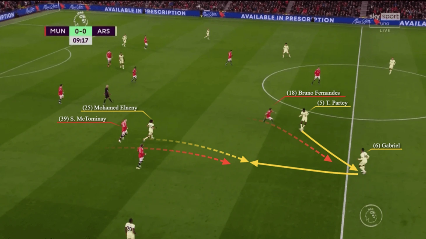 Партей удерживает свою позицию, и тремя пасами в одно касание Арсенал отрезает Фернандеша и Мактоминея из игры, которые преследовали перепасовку Эльнени на Партея.